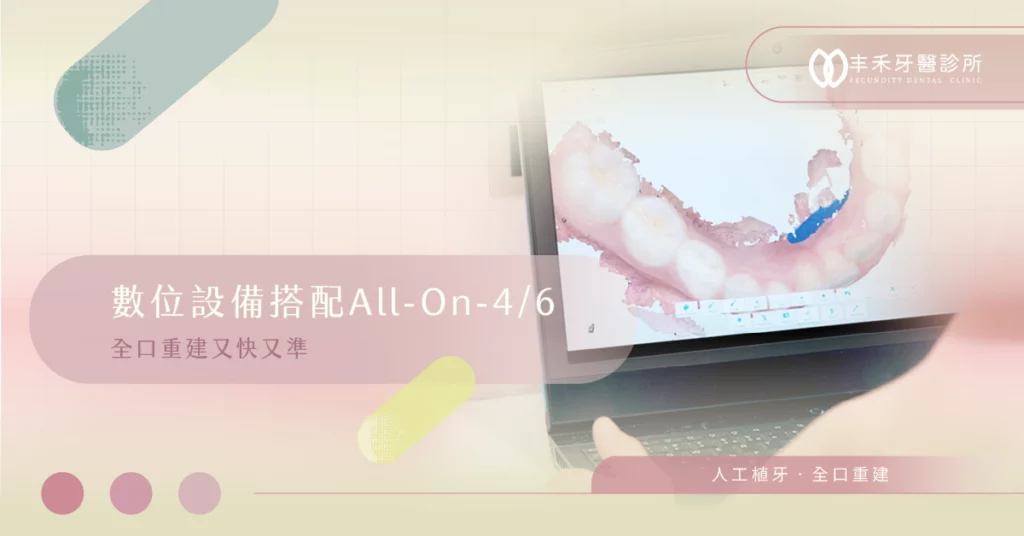 而在All-On-4/6結合數位科技後,整個療程變得更加精準快速,首先在術前透過數位3D電腦斷層掃描,輔助醫師清楚地了解患者的口內狀況、齒槽骨狀況,藉此擬定出更完善的全口治療計畫,並判斷出植體植入的確切位置,以提高手術的成功率。接著在後續的固定式假牙製作上,透過數位口內掃描機來輔助可更迅速、精準的蒐集口內完整資訊,再將蒐集到的數據傳輸至電腦,運算出數位3D模型,讓牙醫師及牙技師能夠更加仔細的在電腦上檢視每顆牙齒的角度及位置,不僅製作出來的假牙更精緻,後續安裝假牙時誤差也能盡量縮小。而透過數位科技的可複製性,更可完整記錄臨時假牙的相關訊息,在置換為正式假牙時可根據複製好的資料再進行微調,使得All-On-4/6最後安裝上的正式假牙更為精準,大幅提升療程的品質與效率。